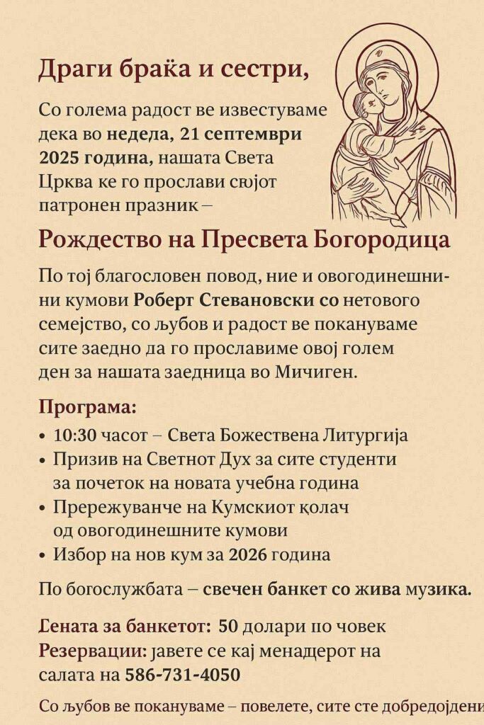 По тој благословен повод, ние и овогодинешни- ни кумови Роберт Стевановски со нетового семејство, со љубов и радост ве покануваме сите заедно да го прославиме овој голем ден за нашата заедница во Мичиген.